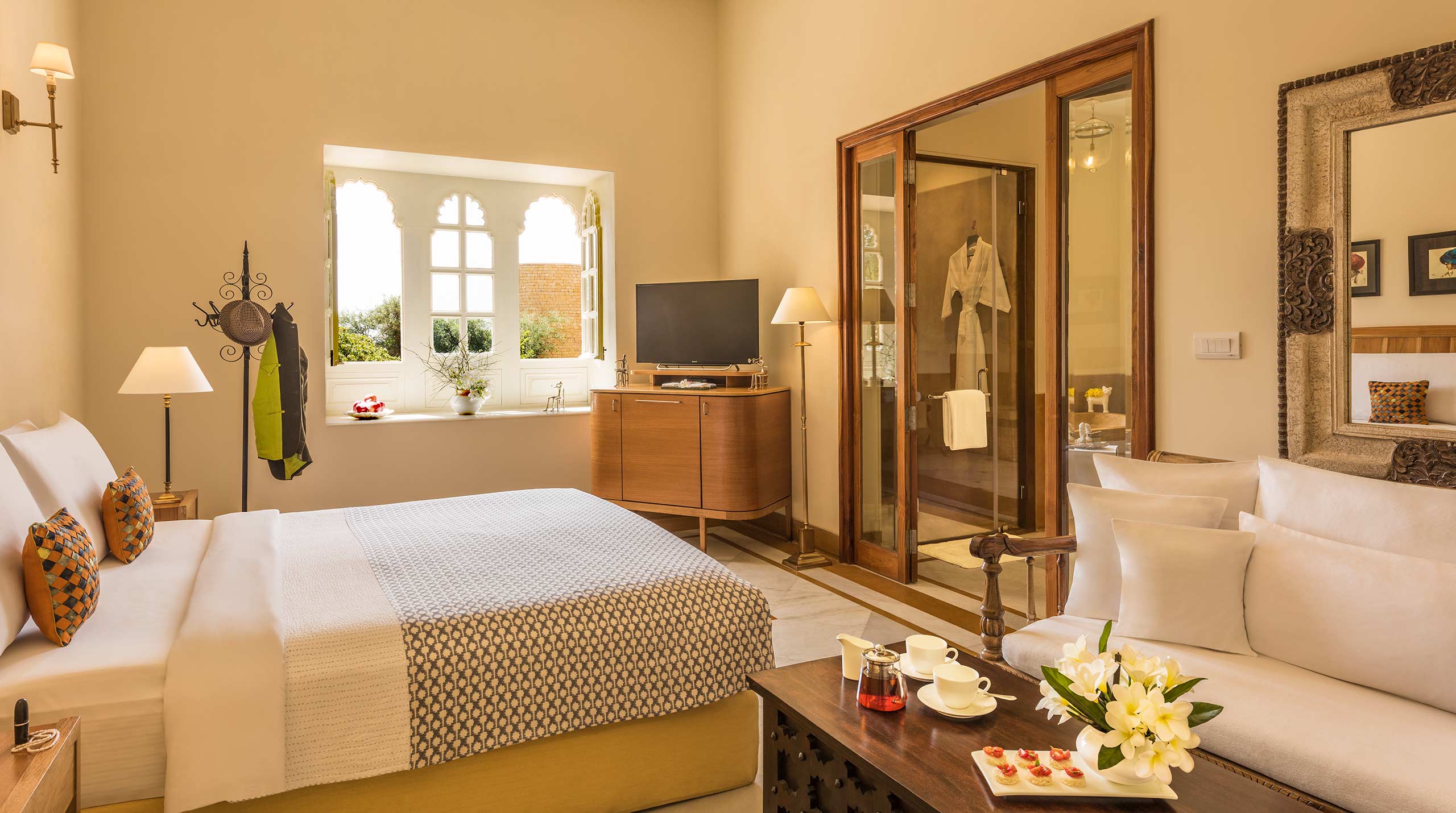 Amidst the golden sands of the desert lies your regal retreat—an exquisite stay awaits. Suryagarh's elegantly appointed rooms seamlessly blend historic charm with contemporary comforts, offering guests a cozy sanctuary complete with views from private verandas and enchanting turret balconies. Each space is thoughtfully designed for those seeking relaxation and an exquisite touch of elegance under the desert sky.